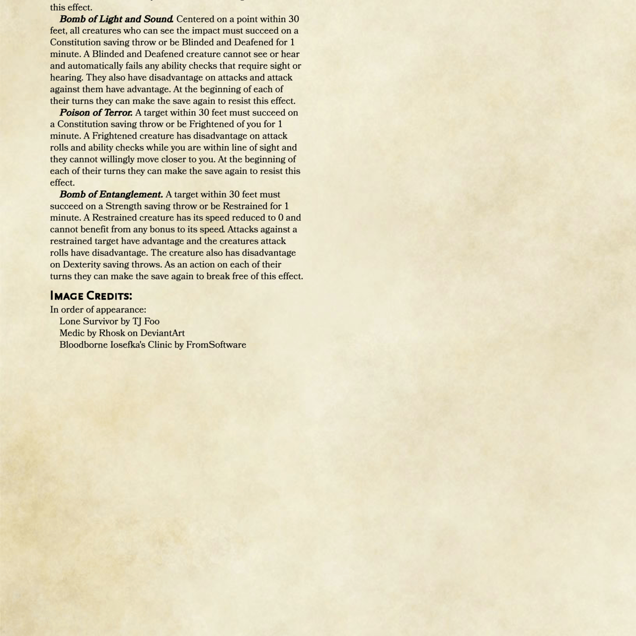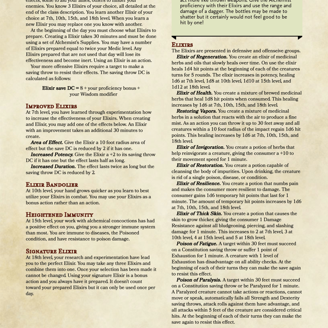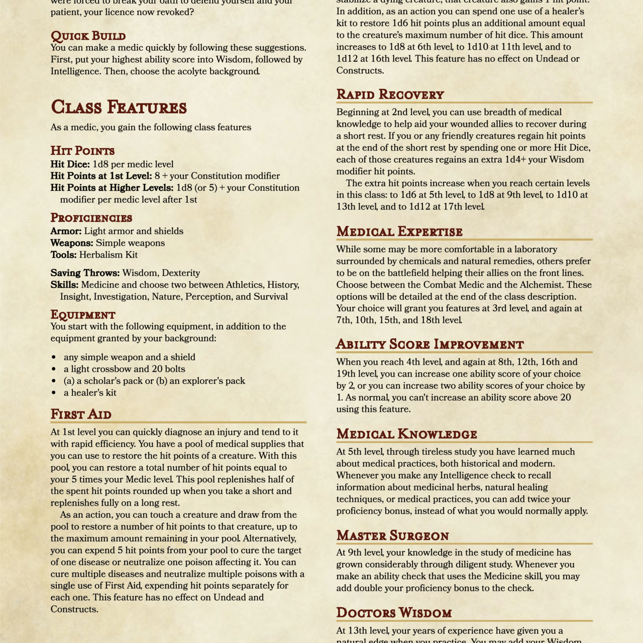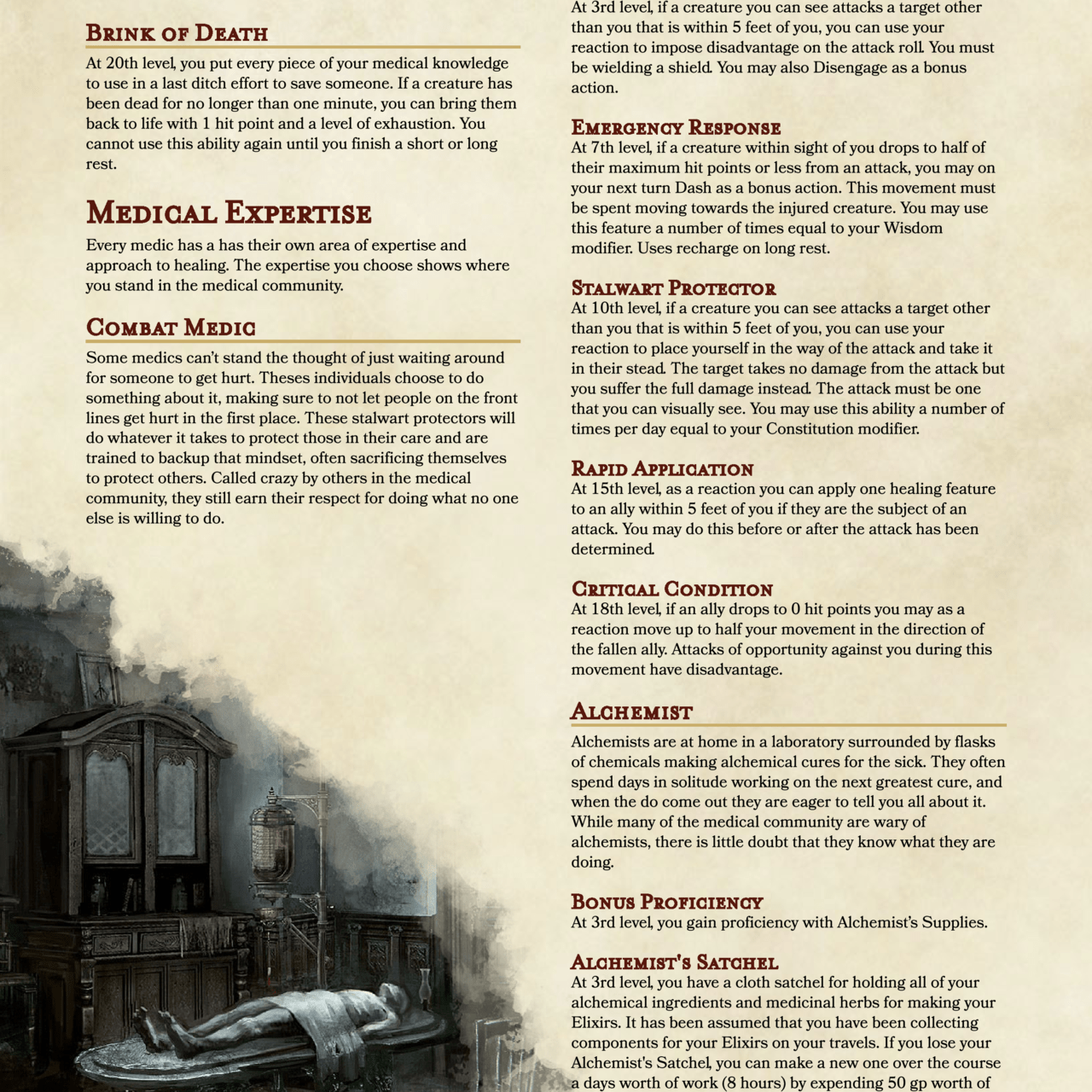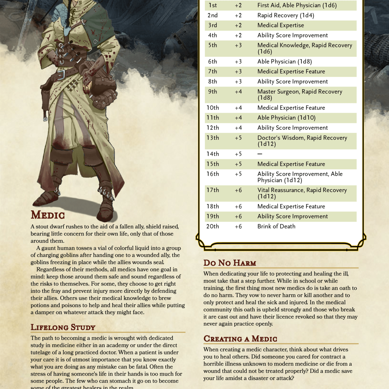 - Added Brink of Death. So something I totally forgot and no one mentioned before or after I had already posted it was the standard for a class to have a 20th level ability. My bad. So I added one and I think it’s pretty fitting for a non-magical healer meant for a non-magical setting.