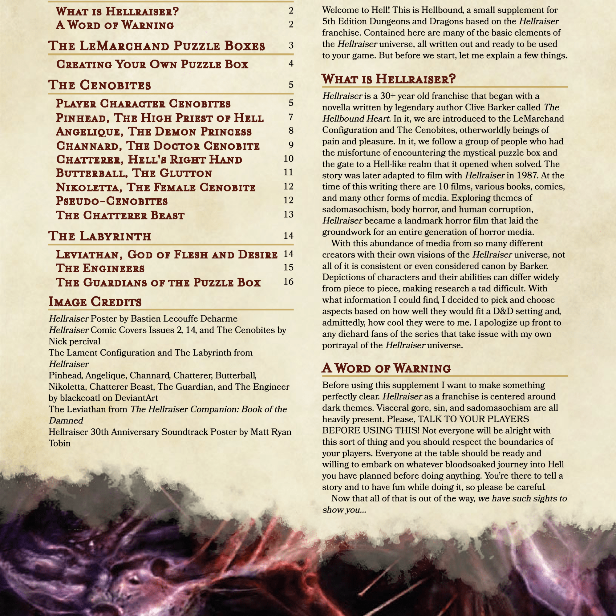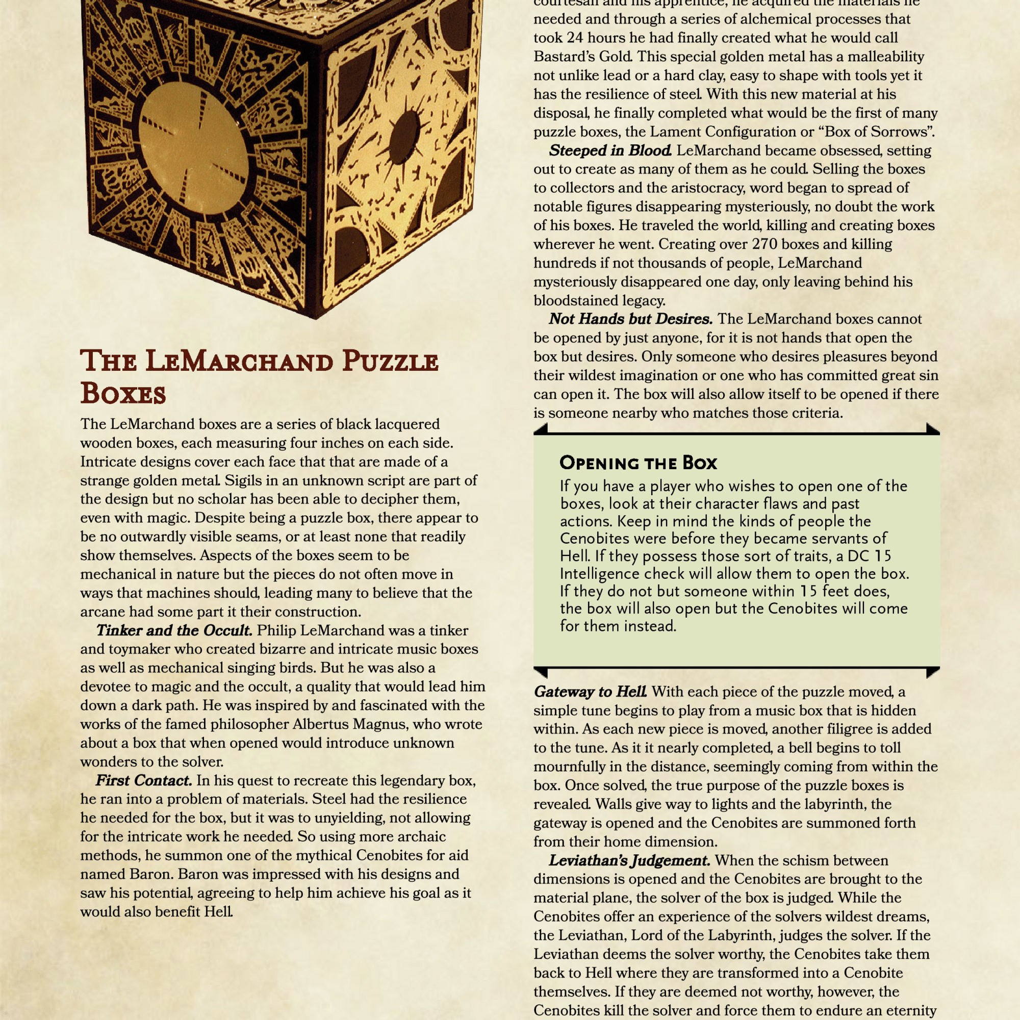 HAPPY HALLOWEEN! IT’S FINALLY DONE! Seriously, this project was way more intensive then I planned and it basically consumed my last 2 weeks. But here it is! It kind of all started with the random thought, as all my stuff does, “What if I made the box from Hellraiser an item.” Aaaand it kind of spiraled from there so here we are. This project has been an ultimate test of my skill as a homebrewer, both in terms of the content and the formatting, which turned out amazingly in my opinion.