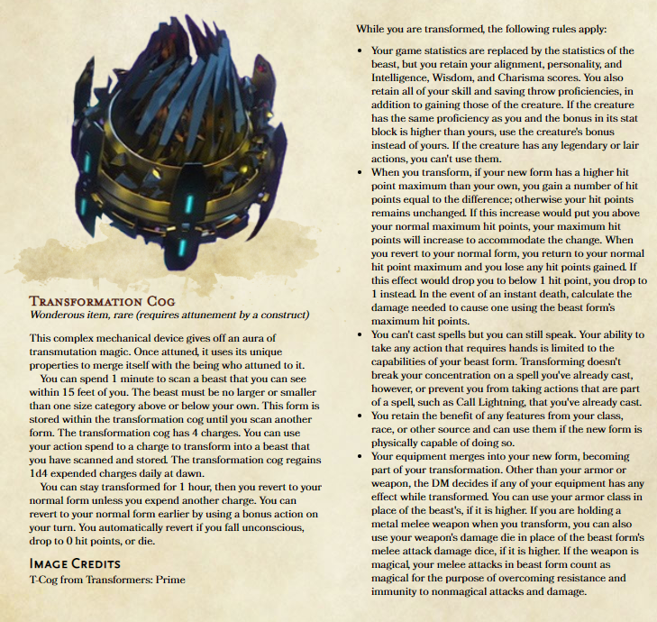 Hey all! This one kind of came out of nowhere. Had a spur of the moment idea for a friends campaign and wanted to make this for my character. For those who can’t tell just by the title, this thing is one giant transformers reference. In universe, its the organ that allows Cybertronians to scan things and transform. Used the druids wildshape as a base then heavily modified for more of that transformers feel.