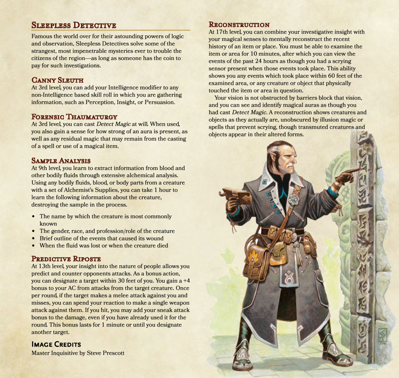 Got another one today, this time for rogues! Another pathfinder conversion, this one is super cool to me, kind of a Harry Dresden meets Sherlock Holmes. I don’t particularly care for the Inquisitive out of Xanathar’s Guide so it’s nice to have this to use. Fun piece of lore while working on it, “Sleepless” isn’t just a descriptor here. It’s actually an interesting organization in one of the pathfinder campaign settings (Paths of Prestige I believe). The Sleepless Agency provides security and investigative services for anyone who can afford them. Just thought that was cool. Anyway, hope you guys like it!