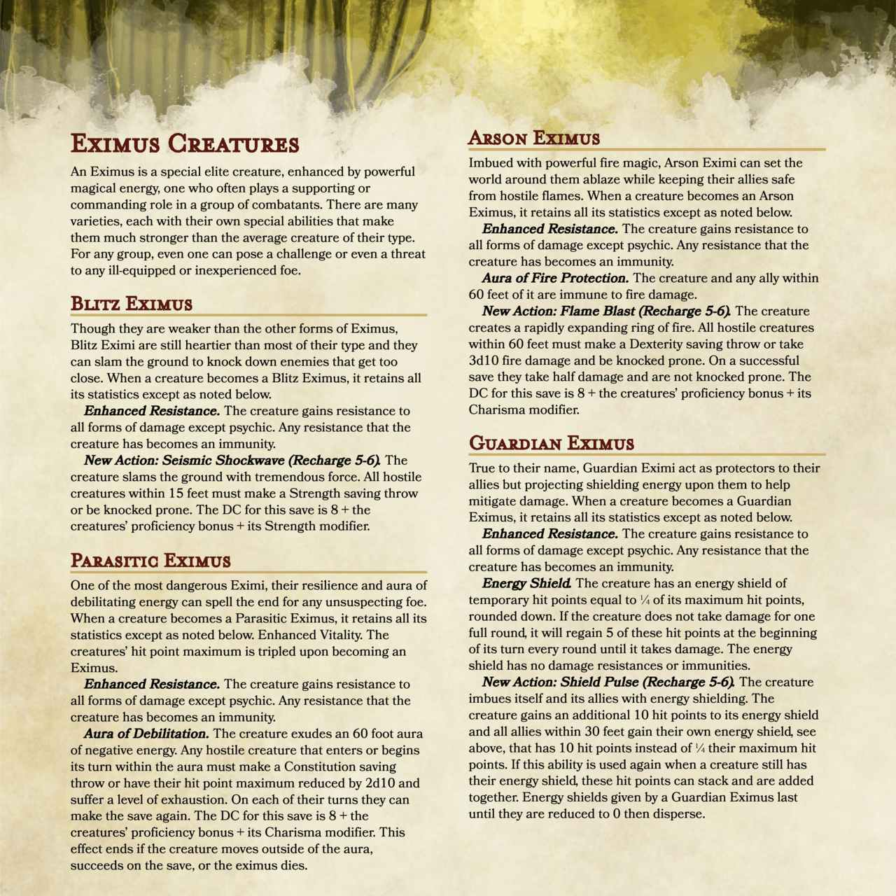 Oh boy, more monster stuff! Bit of a conversion, Warframe has a neat game thing with special elite enemies known as Eximus units. Always thought they were a cool bit of design and would make a good template for monsters when you want buff them.