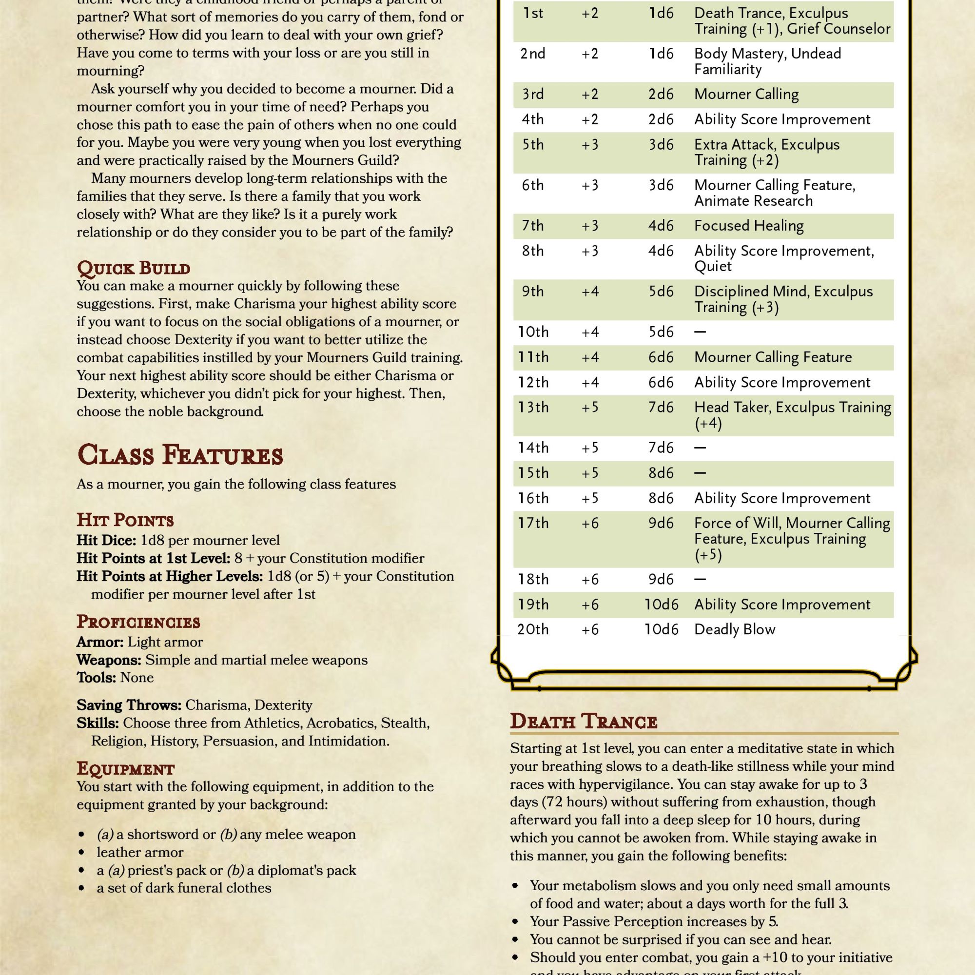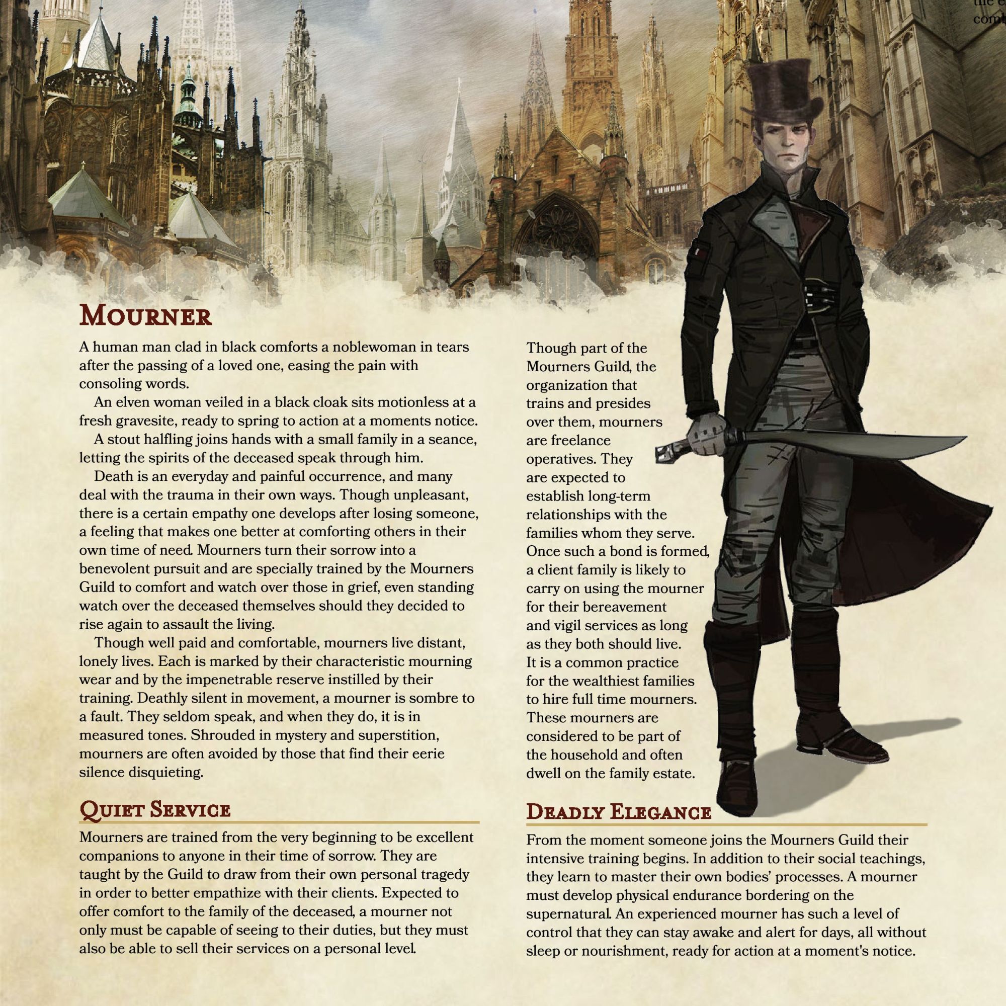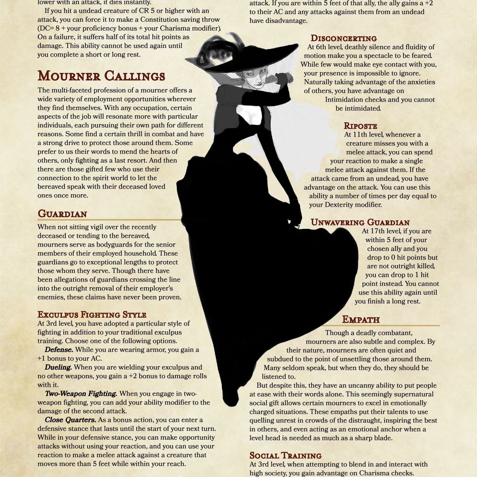 IT’S FINALLY DONE! After months of work my newest class is ready for the world. For those that don’t recognize it, the mourner was originally one of the callings for the Unhallowed system, which is basically just the steampunk zombie apocalypse. Somber and unnerving, the mourner is a martial class that specializes in dispatching undead. Fair warning, I would recommend running this class in a game that has a lot of undead and death to make the most of the mourners abilities. I tried to make the original features as universally applicable as I could but we’ll see once I start playtesting. Speaking of, I am actively playing it in a campaign so expect updates at some point.