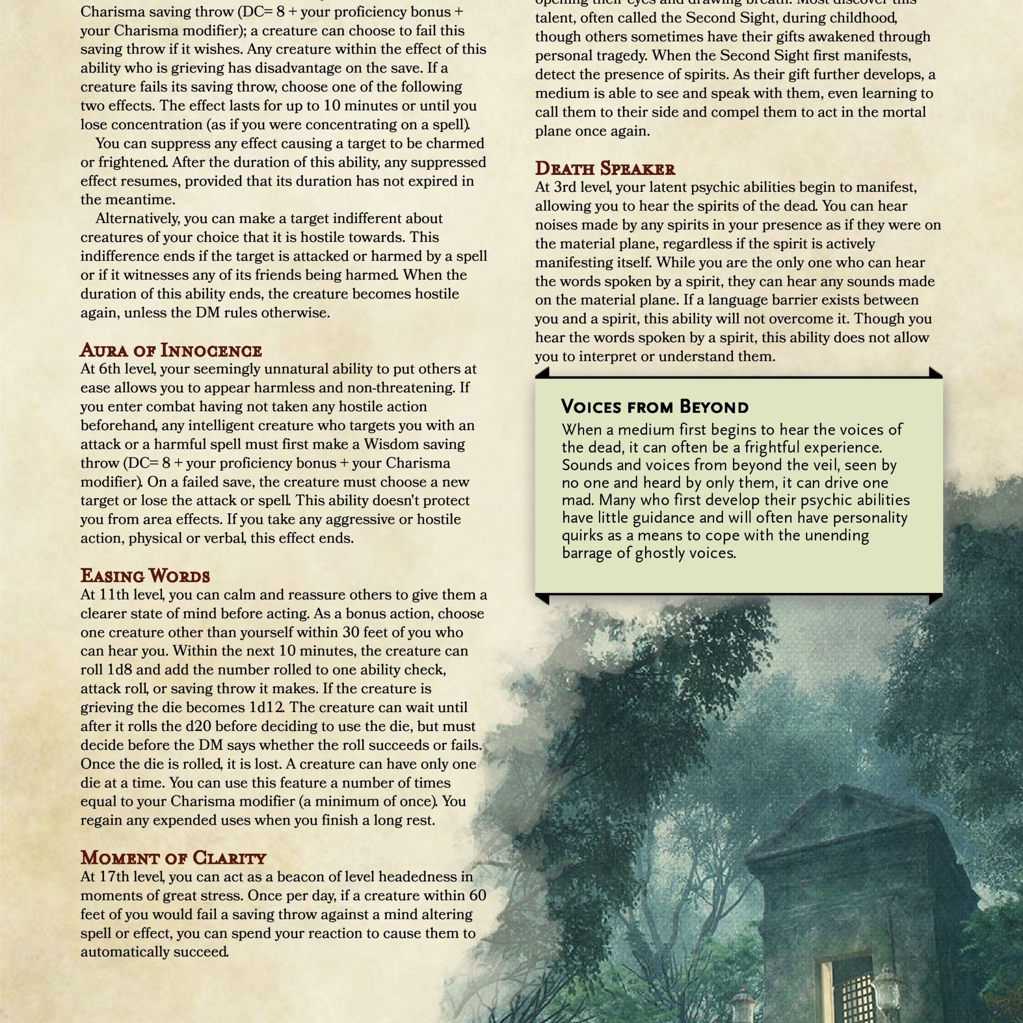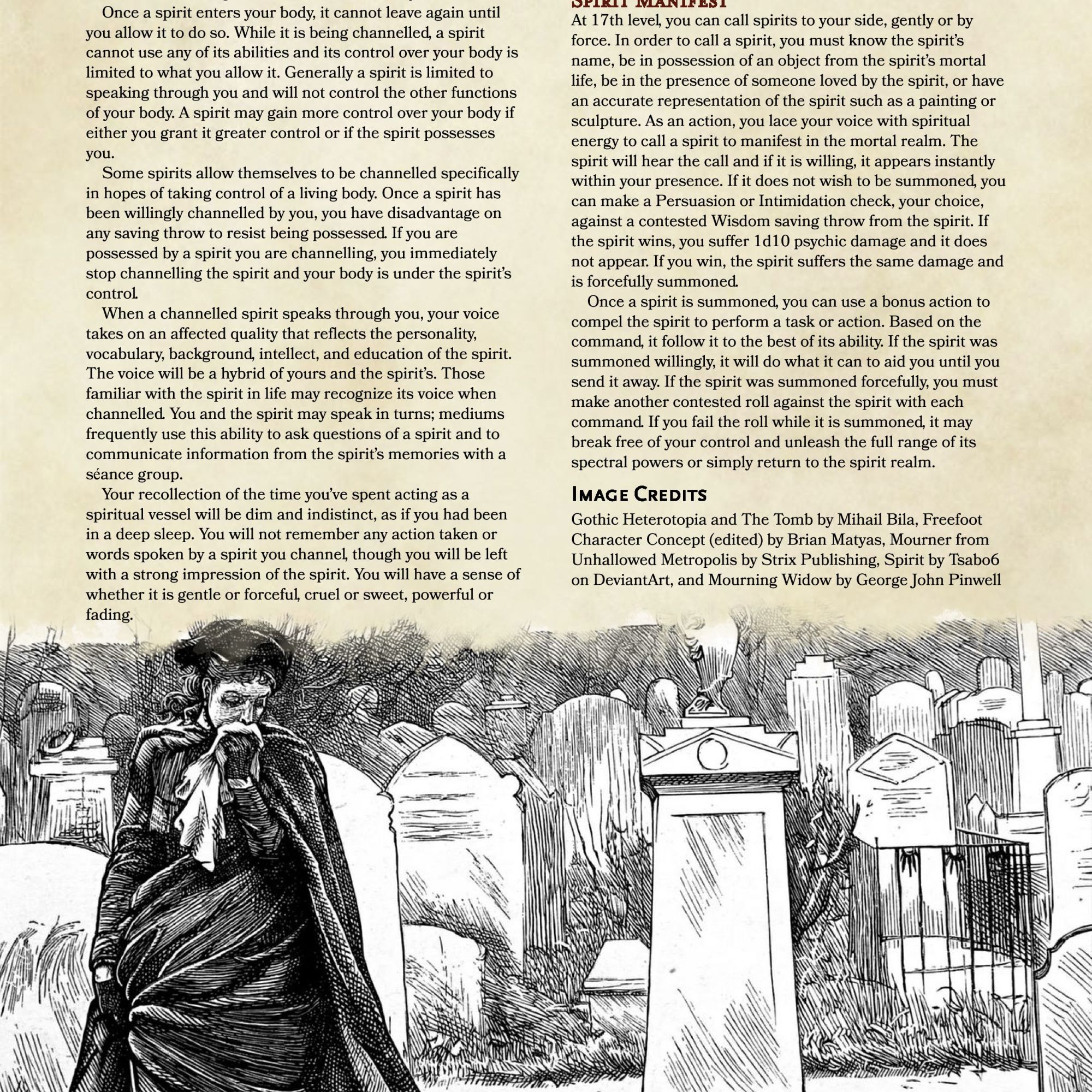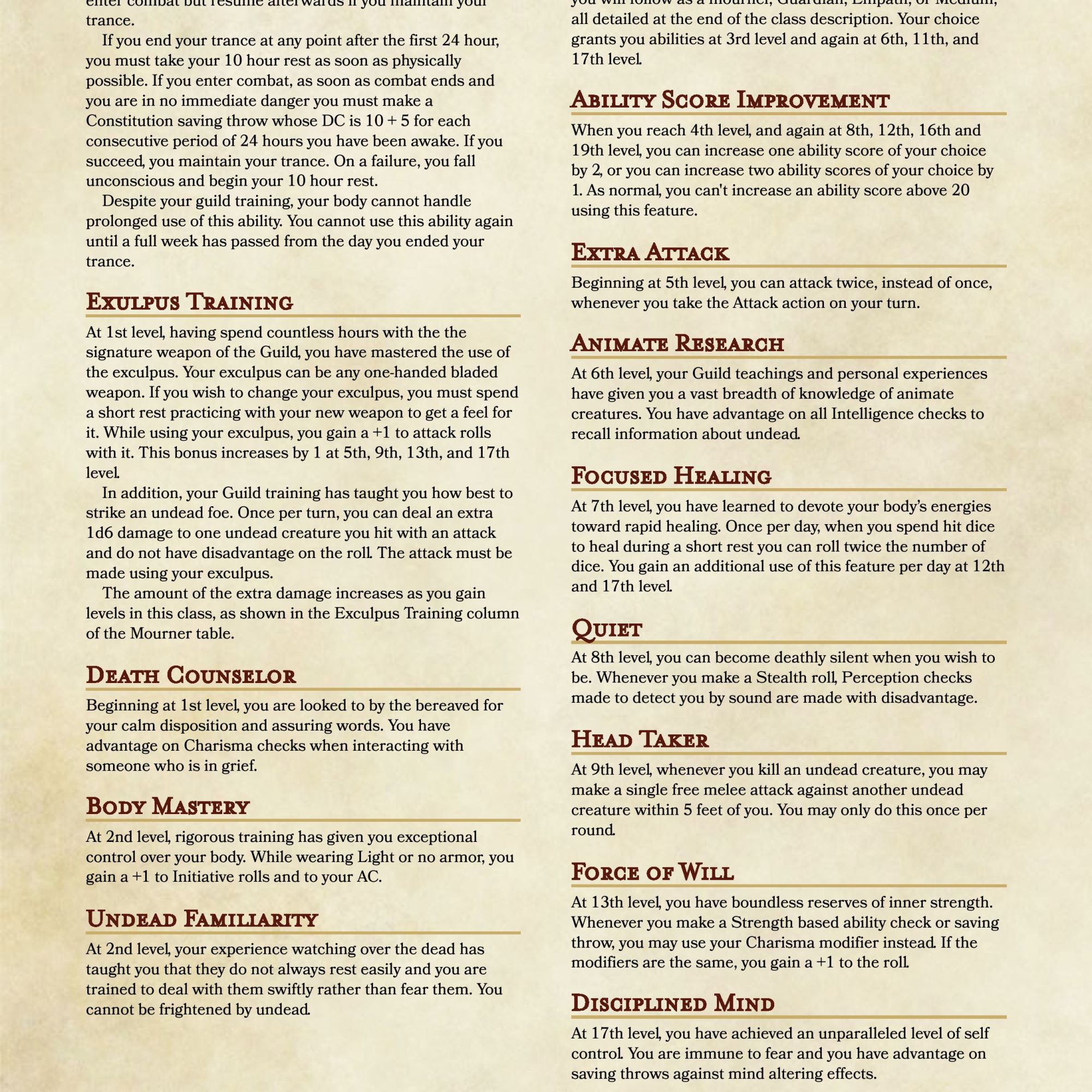 IT’S FINALLY DONE! After months of work my newest class is ready for the world. For those that don’t recognize it, the mourner was originally one of the callings for the Unhallowed system, which is basically just the steampunk zombie apocalypse. Somber and unnerving, the mourner is a martial class that specializes in dispatching undead. Fair warning, I would recommend running this class in a game that has a lot of undead and death to make the most of the mourners abilities. I tried to make the original features as universally applicable as I could but we’ll see once I start playtesting. Speaking of, I am actively playing it in a campaign so expect updates at some point.