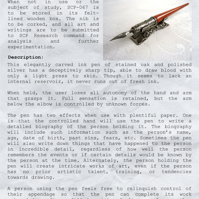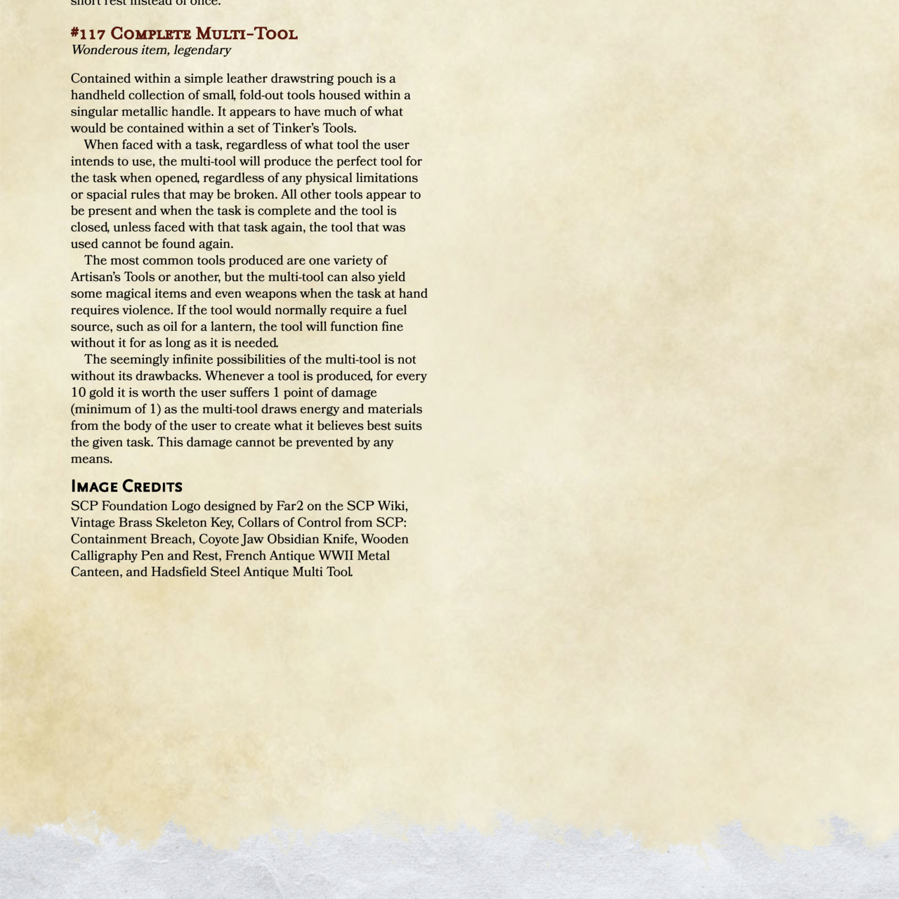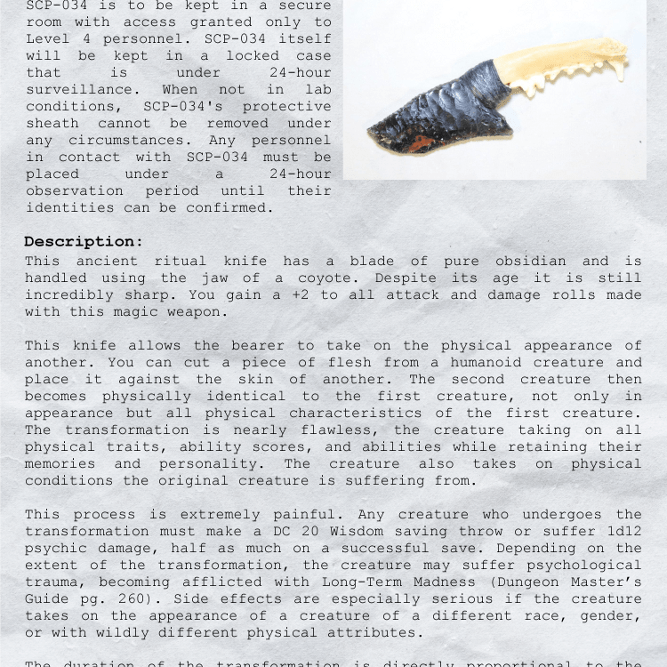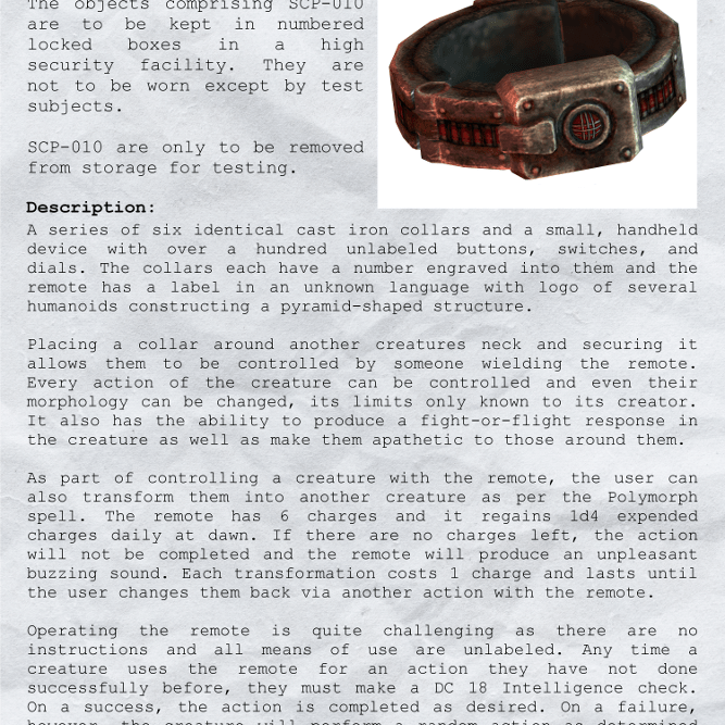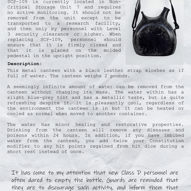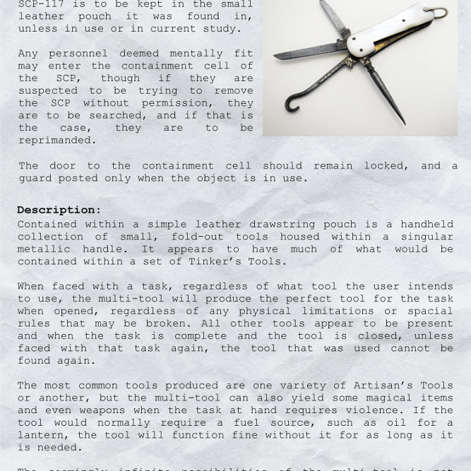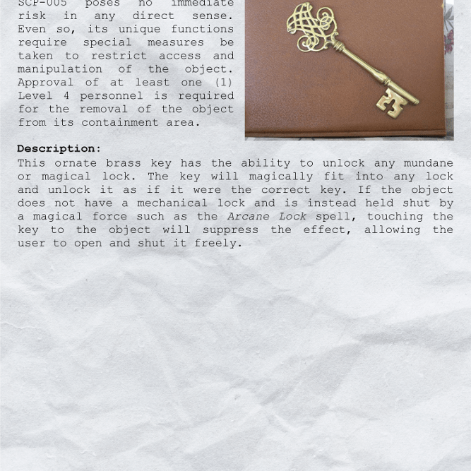 So why SCP’s? What makes them so special? Well they’re basically magical items in a real world setting. Some are pretty tame with only minor benefits while other more powerful one can have some serious backlash. Some are even potentially world-ending! And honestly there are just so many that I would love to just drop into the hands of a party and see what they do with it. Would make for some great stories.
