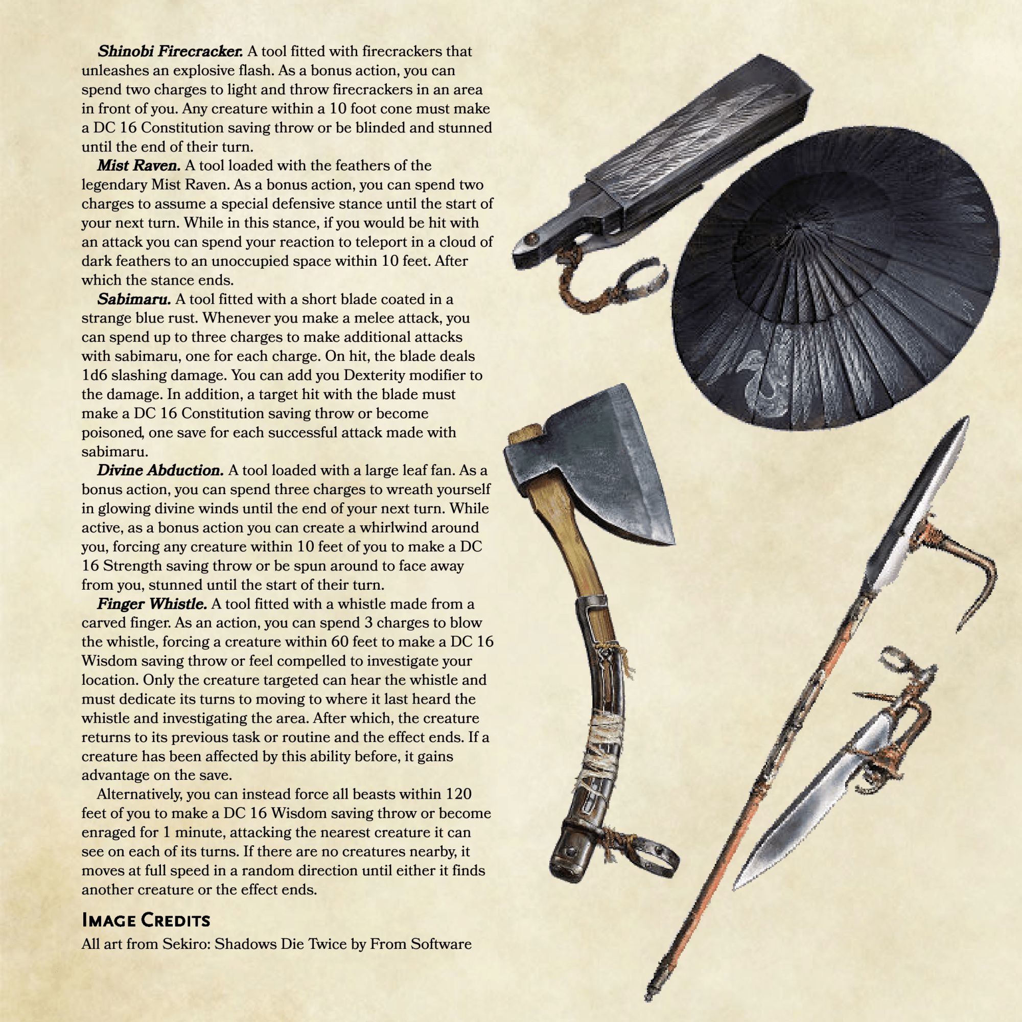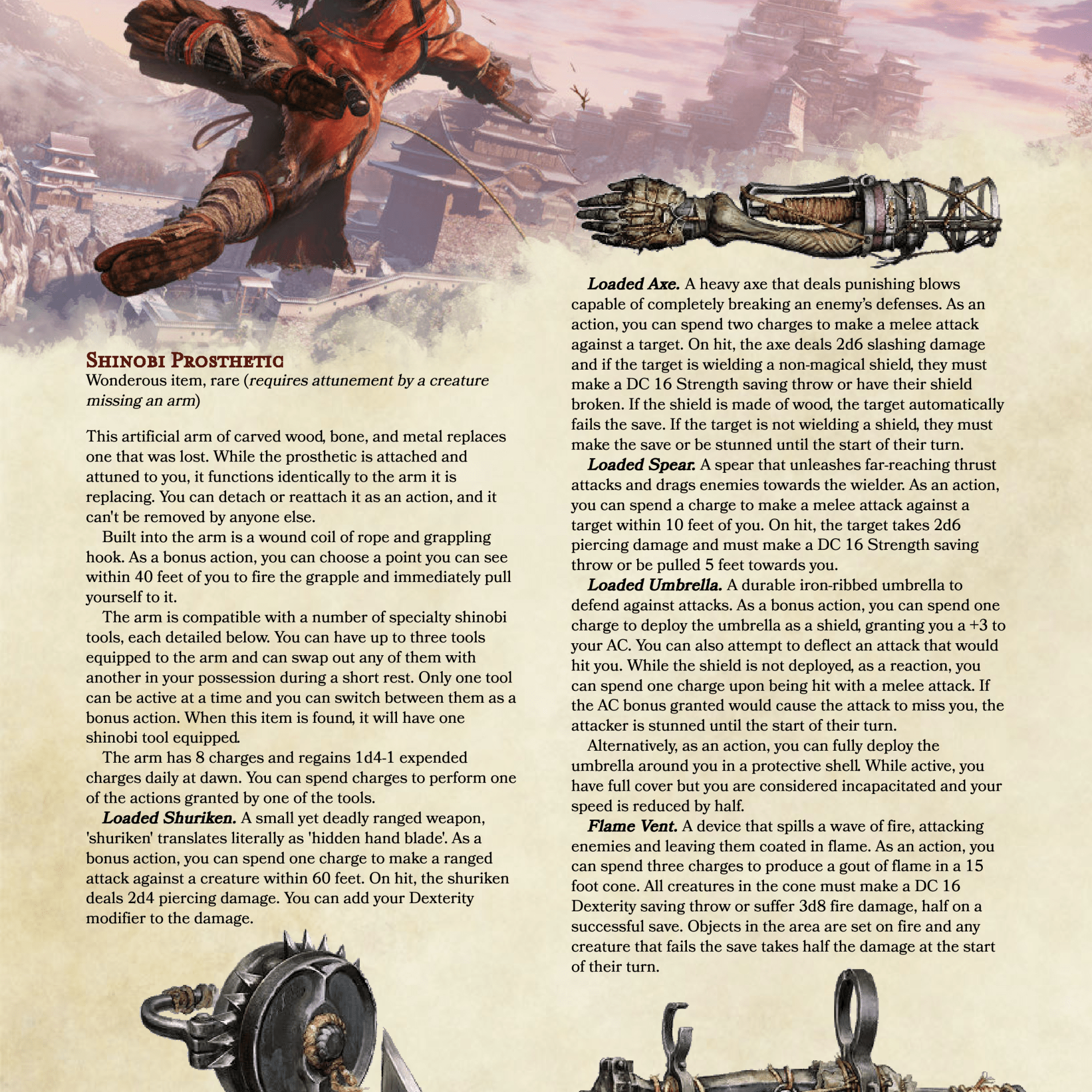 Oh boy, this one has me excited! I have a huge love for prosthetics for some reason and ever since Sekiro: Shadows Die Twice came out I’ve wanted to bring this nifty little gadget into DnD. I like to think I’ve done the various tools justice in my conversion and now all I need is a reason for one of my characters to lose an arm…