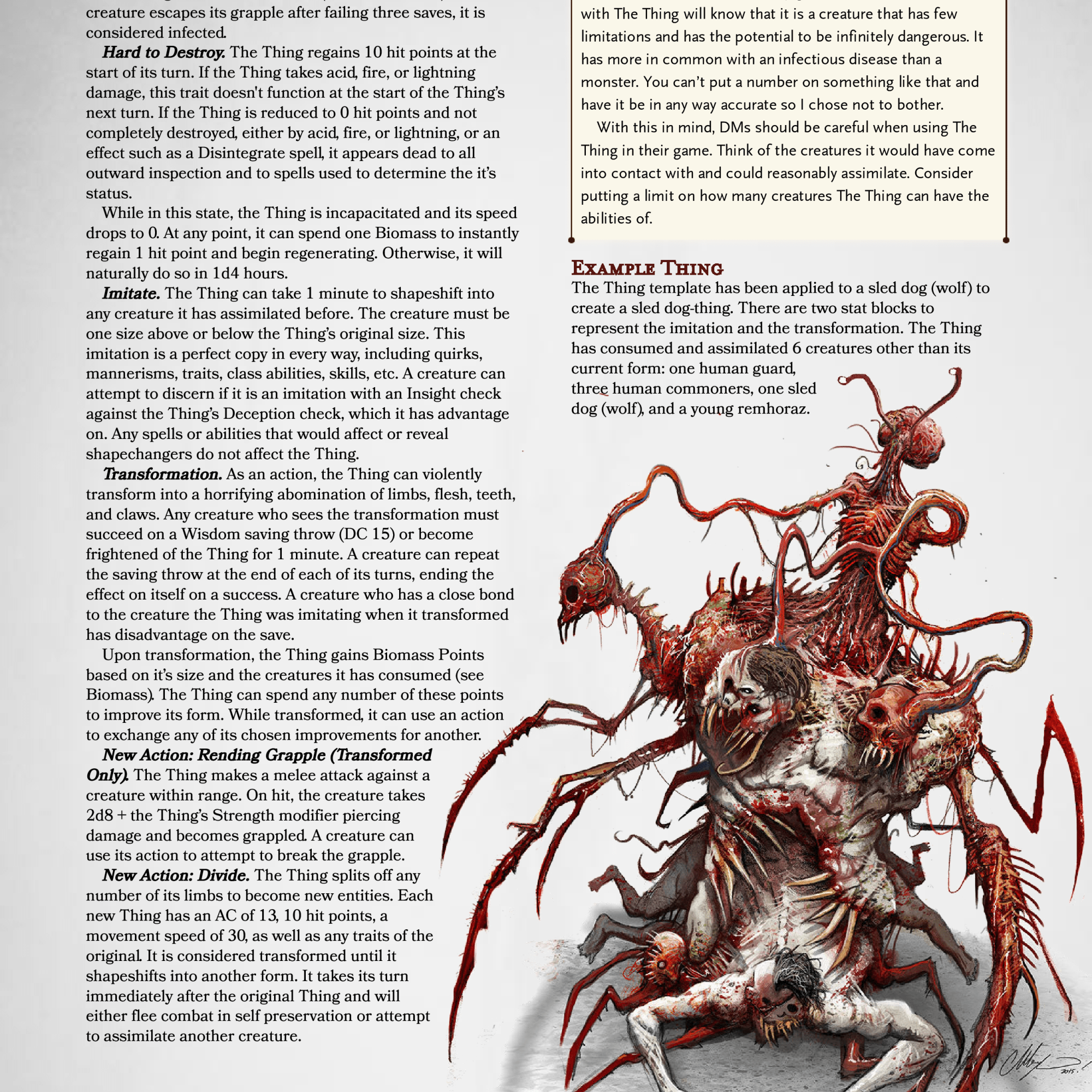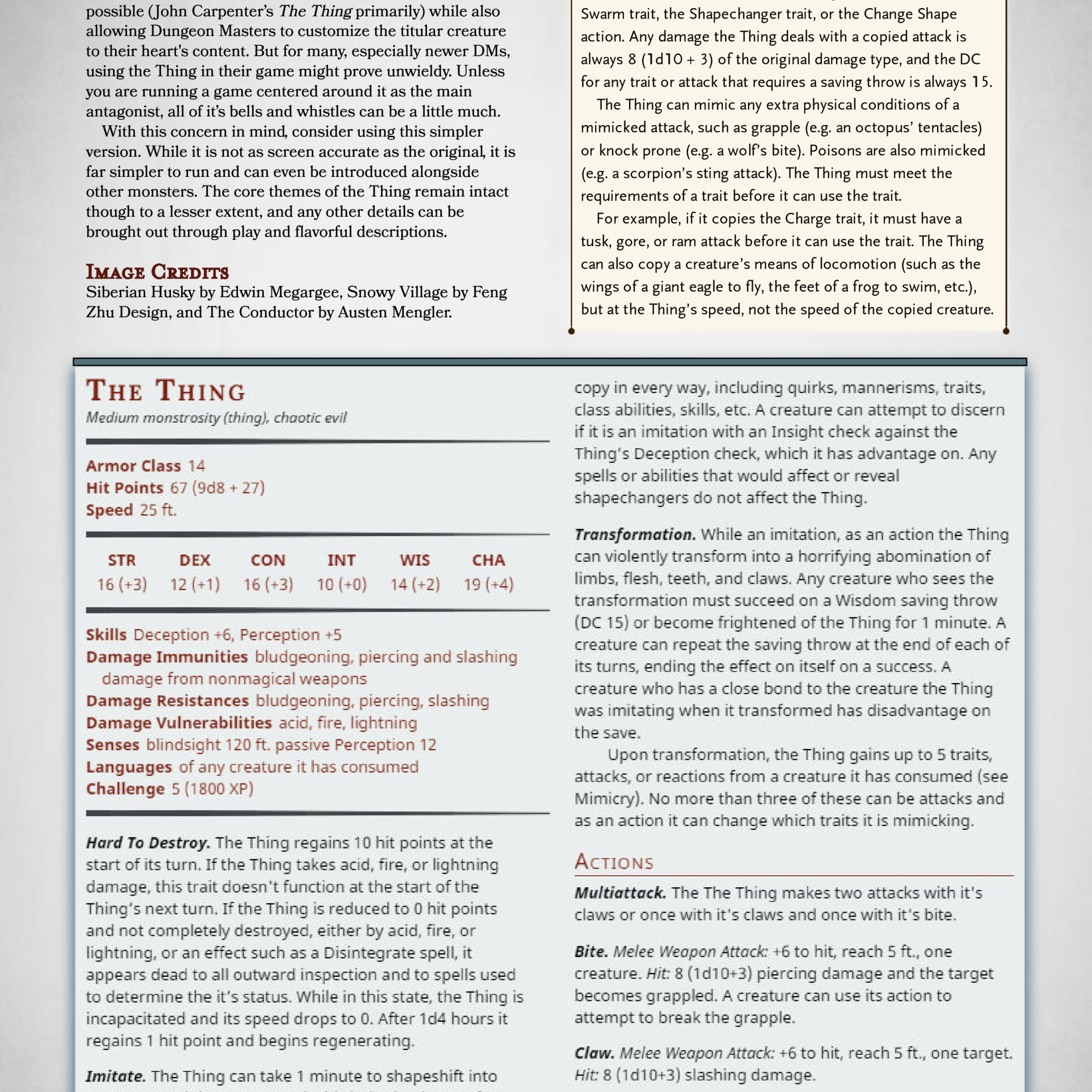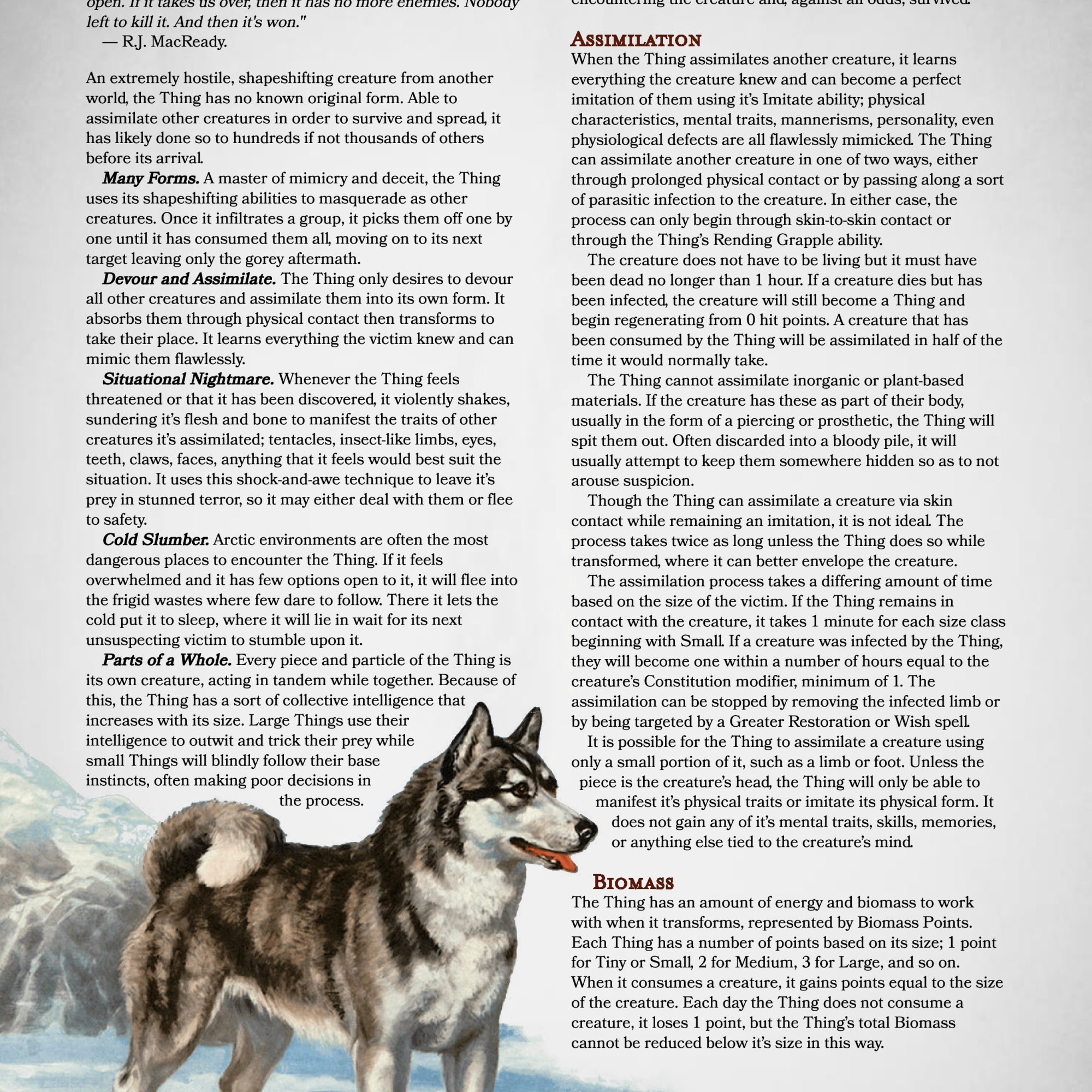 As is usually the case, I tried to replicate how the creature works in universe as accurately as I can with game mechanics, yielding in my opinion a faithful if complicated system. It’s a little bonkers but it works for what I wanted to achieve. A little word of warning, though. Because of the nature of The Thing, I didn’t give it a challenge rating since it wouldn’t be accurate anyway. Take care when using in your own games. But not too careful. After all, man is the warmest place to hide…