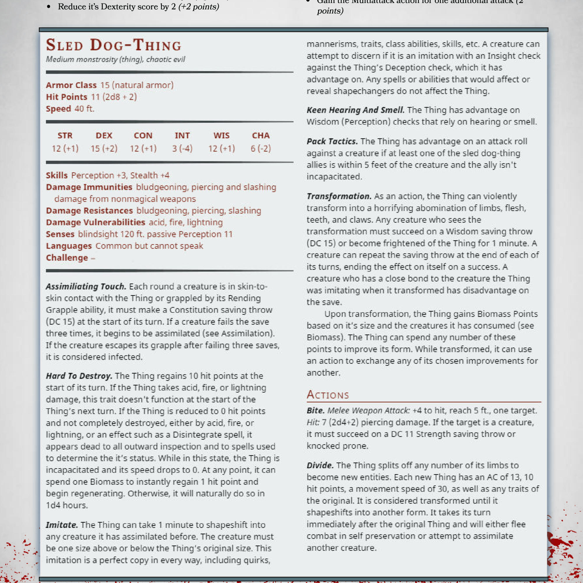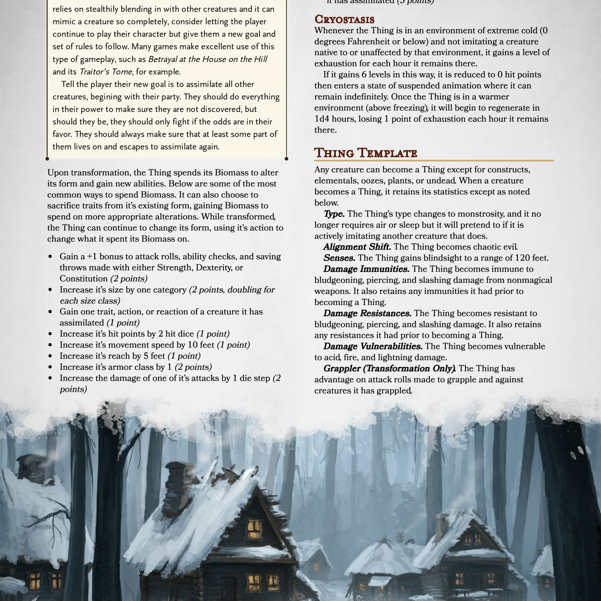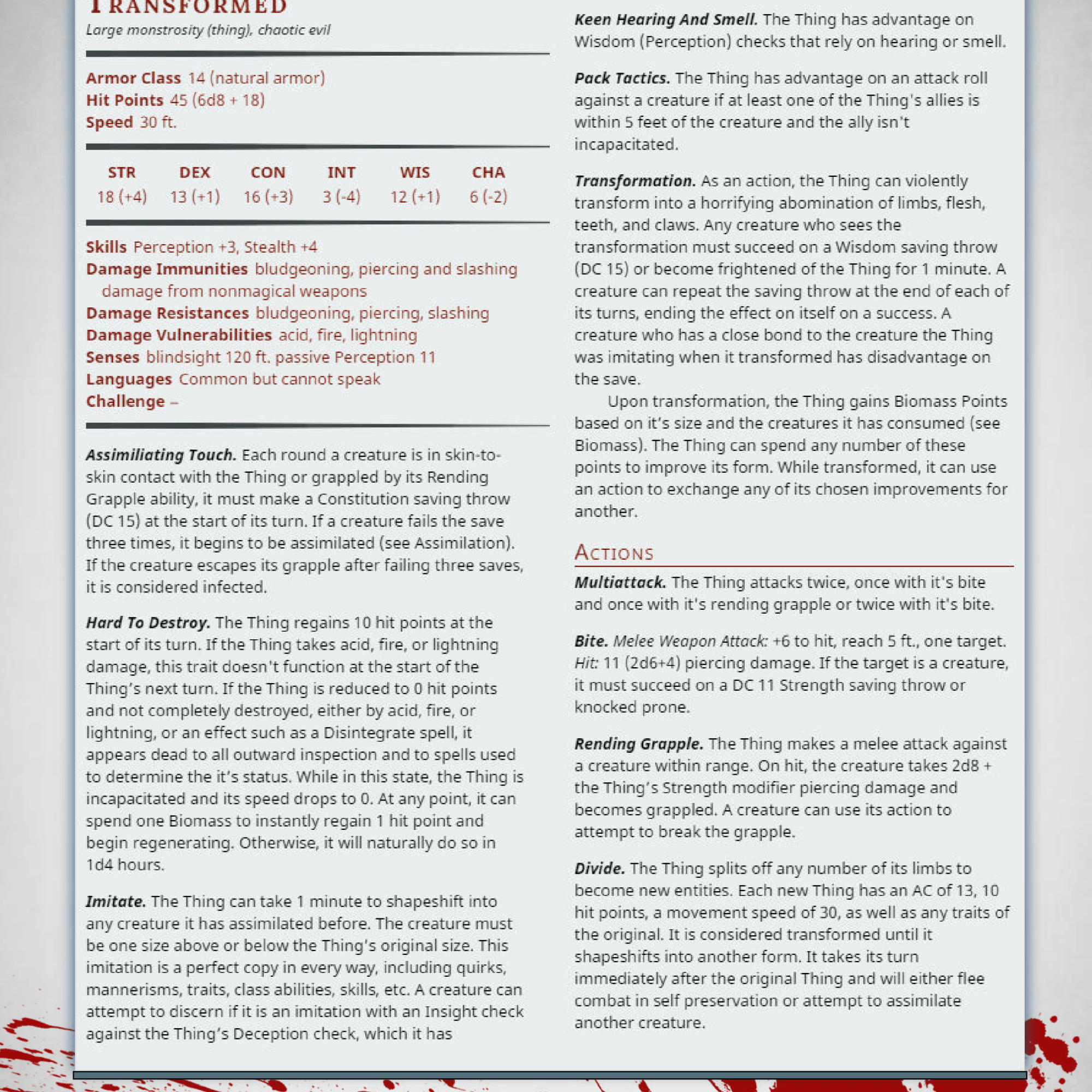 As is usually the case, I tried to replicate how the creature works in universe as accurately as I can with game mechanics, yielding in my opinion a faithful if complicated system. It’s a little bonkers but it works for what I wanted to achieve. A little word of warning, though. Because of the nature of The Thing, I didn’t give it a challenge rating since it wouldn’t be accurate anyway. Take care when using in your own games. But not too careful. After all, man is the warmest place to hide…