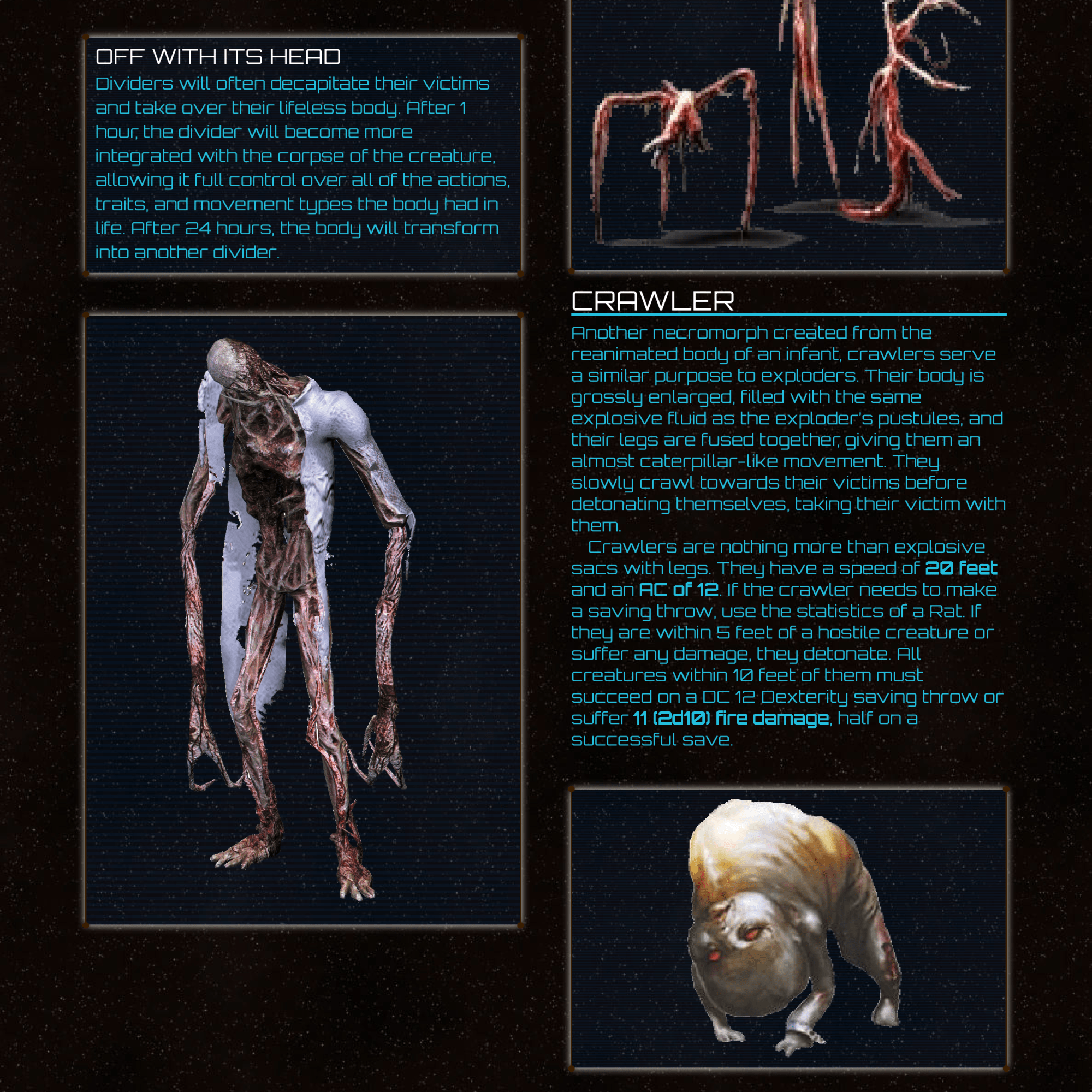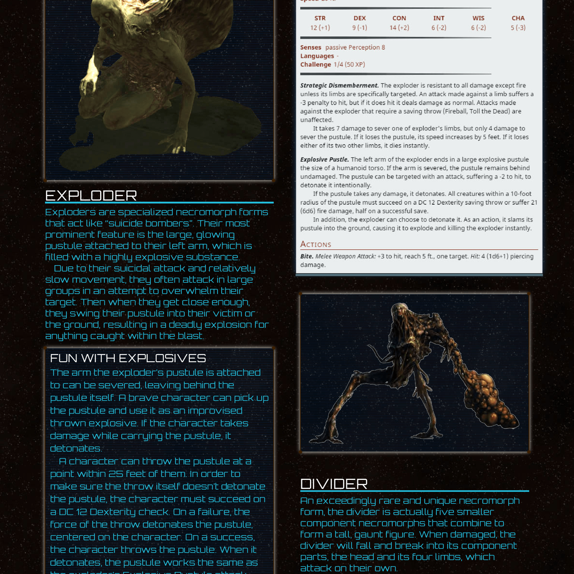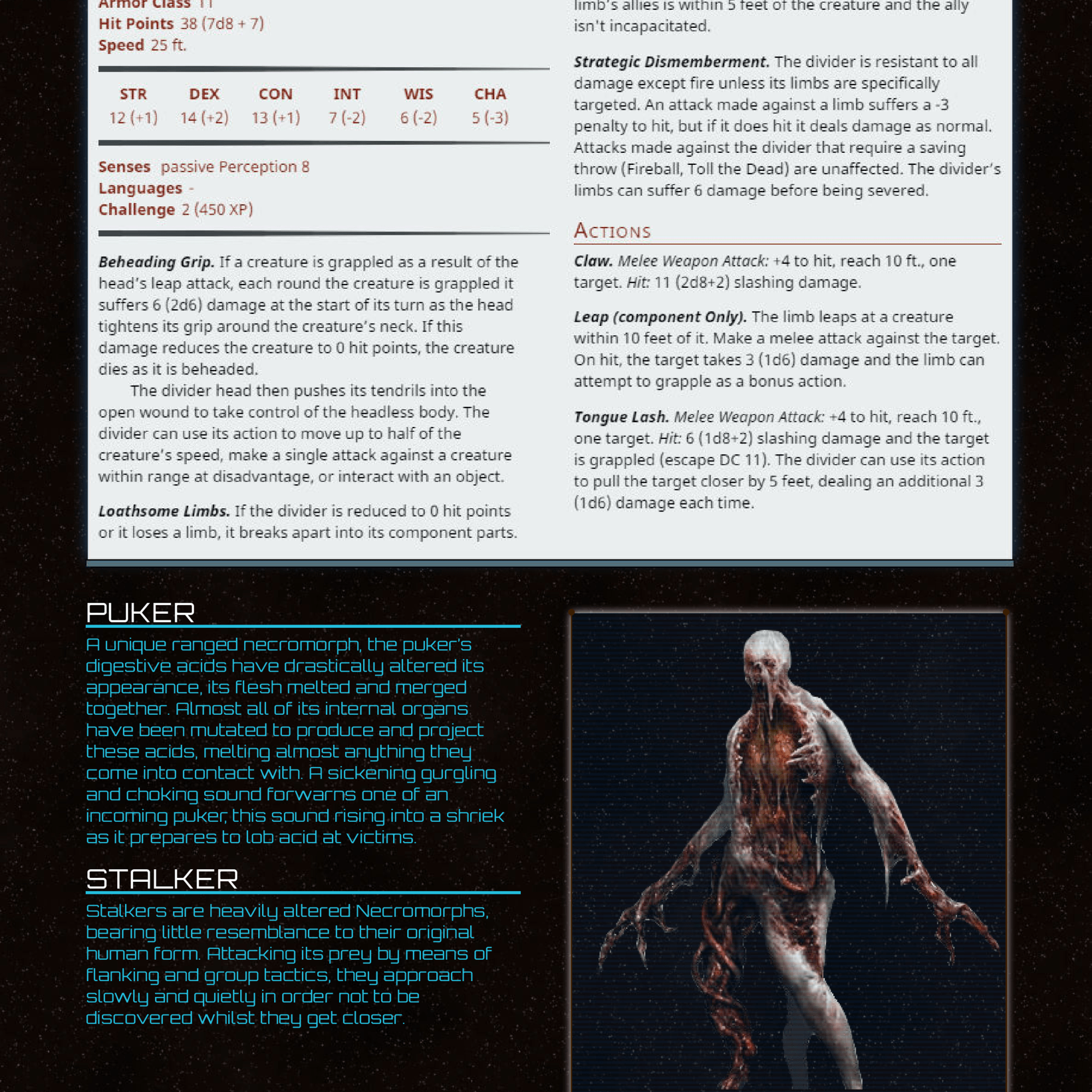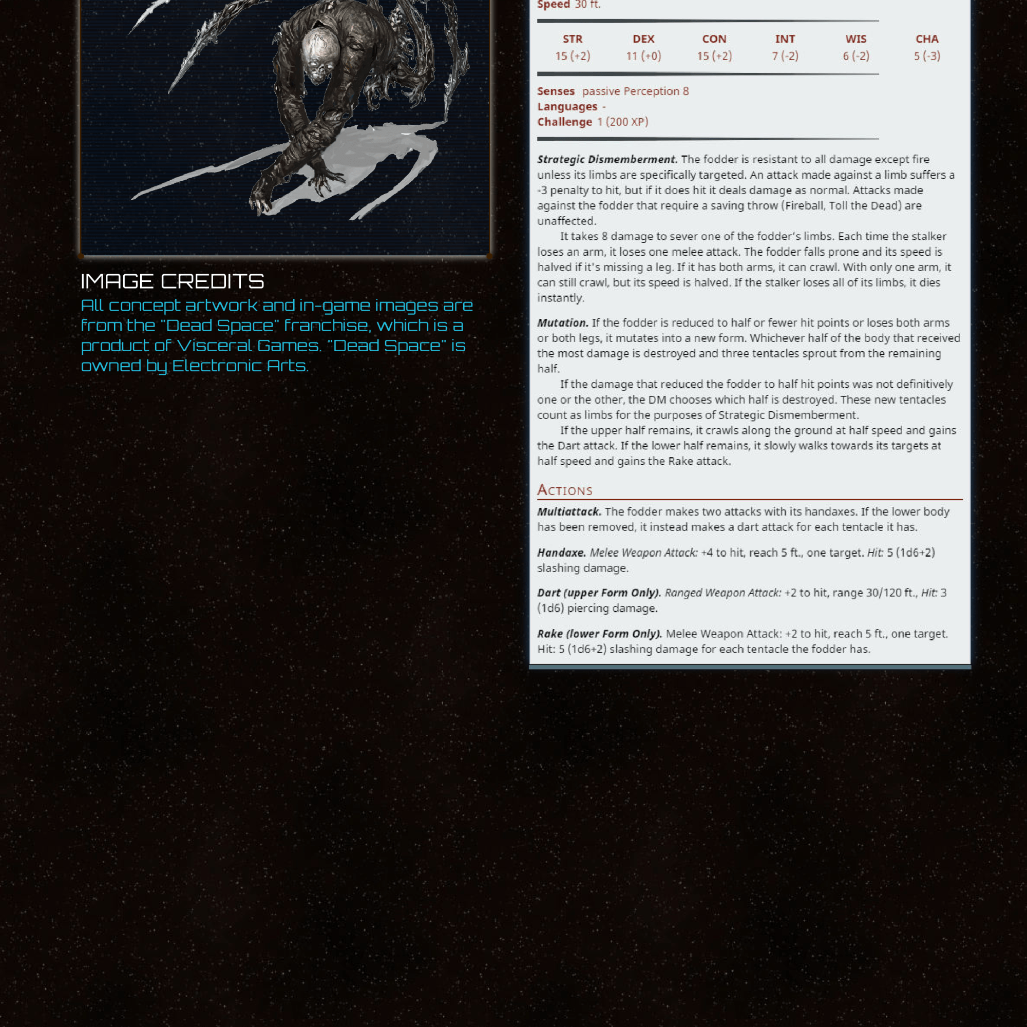Something else to mention is that this is only the beginning. This project has laid a lot of the groundwork for the eventual full Dead Space supplement I want to do. More mechanics, better artwork, more monsters, items, the whole shebang. Hell, this isn’t even the end for this particular brew either! Because I had to rush it, I’m going to be taking the time after a while to start updating it and release those over time. A truly Bethesda move, but I really wanted to maintain my release record for the last 2 years.