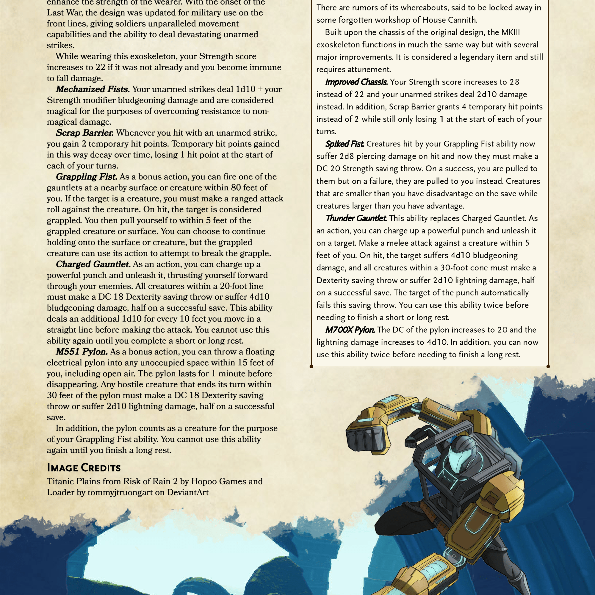 Fairly happy with how she turned out. Ended up being a bigger page than I expected but it worked out nice enough. Though that said it’s only after I already have her done that I have ideas for a different, and I think better, way to do her. Thinking a base frame for the armor with all of the abilities as modular upgrades with some other stuff and maybe some things from the original Risk of Rain. It would be more thematic given that I went with an Eberron origin for it. You’ll likely see a rework of her at some point but in the mean time this is still a pretty good version of her in my opinion.