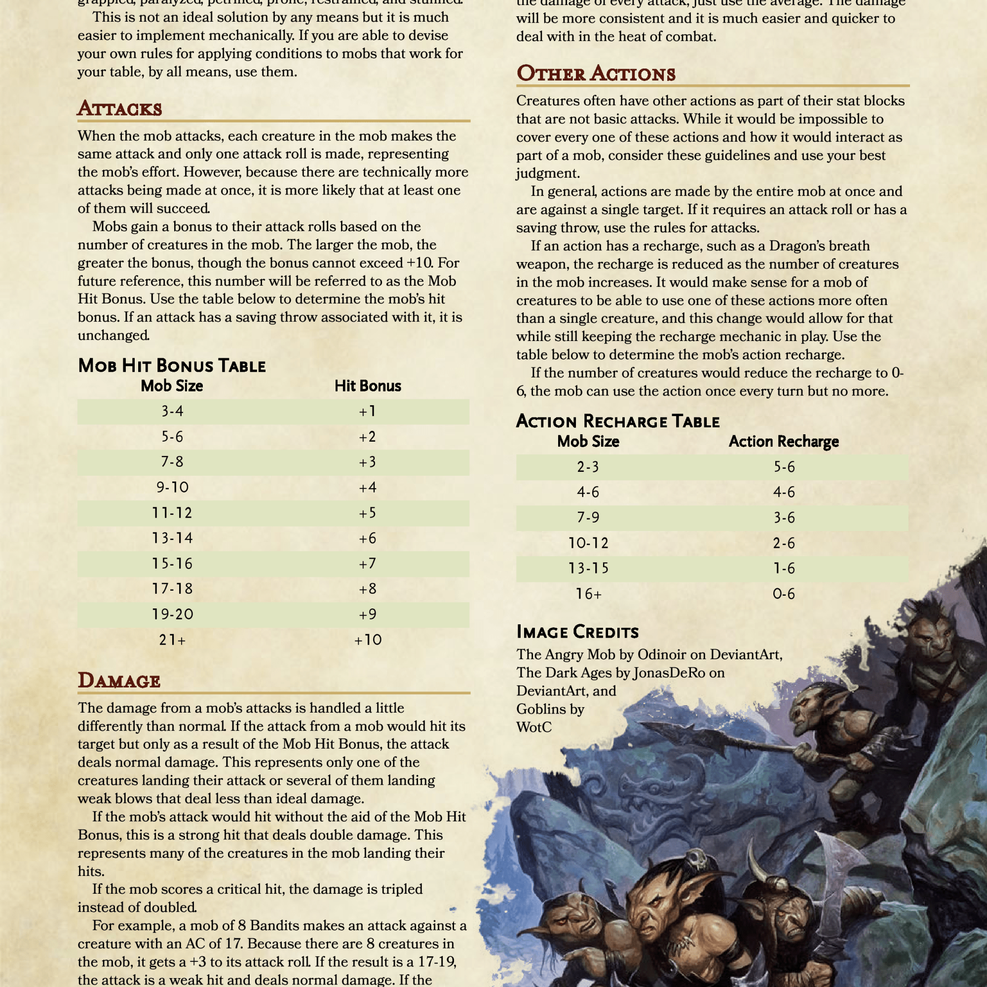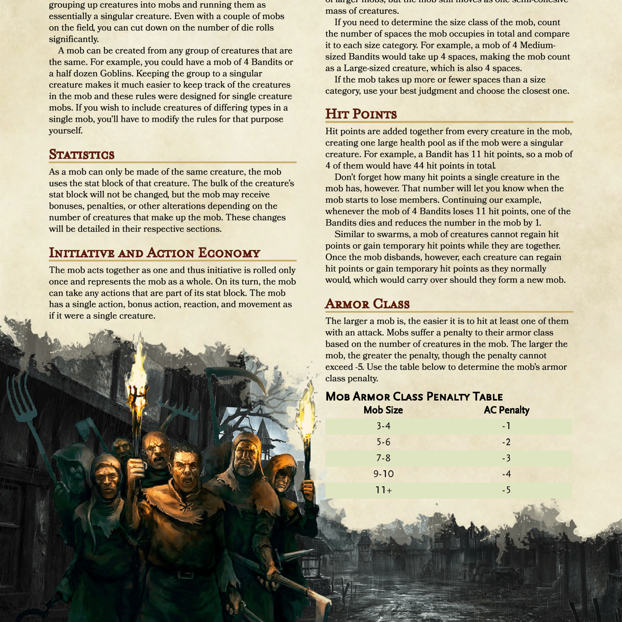 Got something a little different today. As part of a much larger project I’m working on, I put together a pretty major overhaul to the exiting mob rules in the DMG since they’re frankly pathetic. It’s a good piece to have as a solo brew so I thought I’d release it separately (and to have something else out while I work on other stuff).