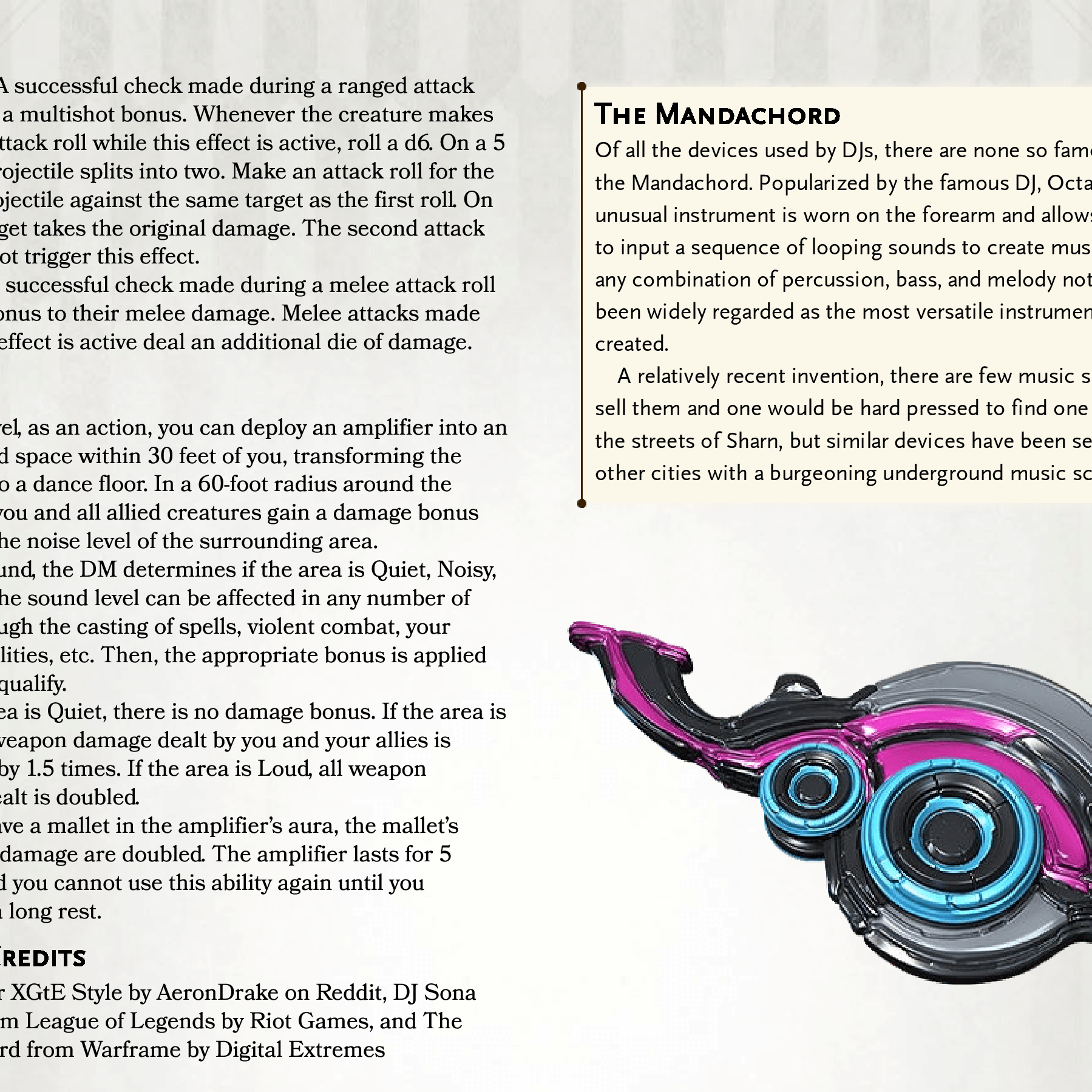I wanted to do another Warframe conversion and one for a class I sadly don’t have much content for. I did a single Bard subclass back when I first started and never went back for some reason. Octavia is the obvious choice for Bard since that’s literally what she is, but I’m giving it a bit more of a magitech vibe since all of her music stuff is through high tech instruments and gadgets. I actually thought about going Artificer for a bit but Bard was too perfect.