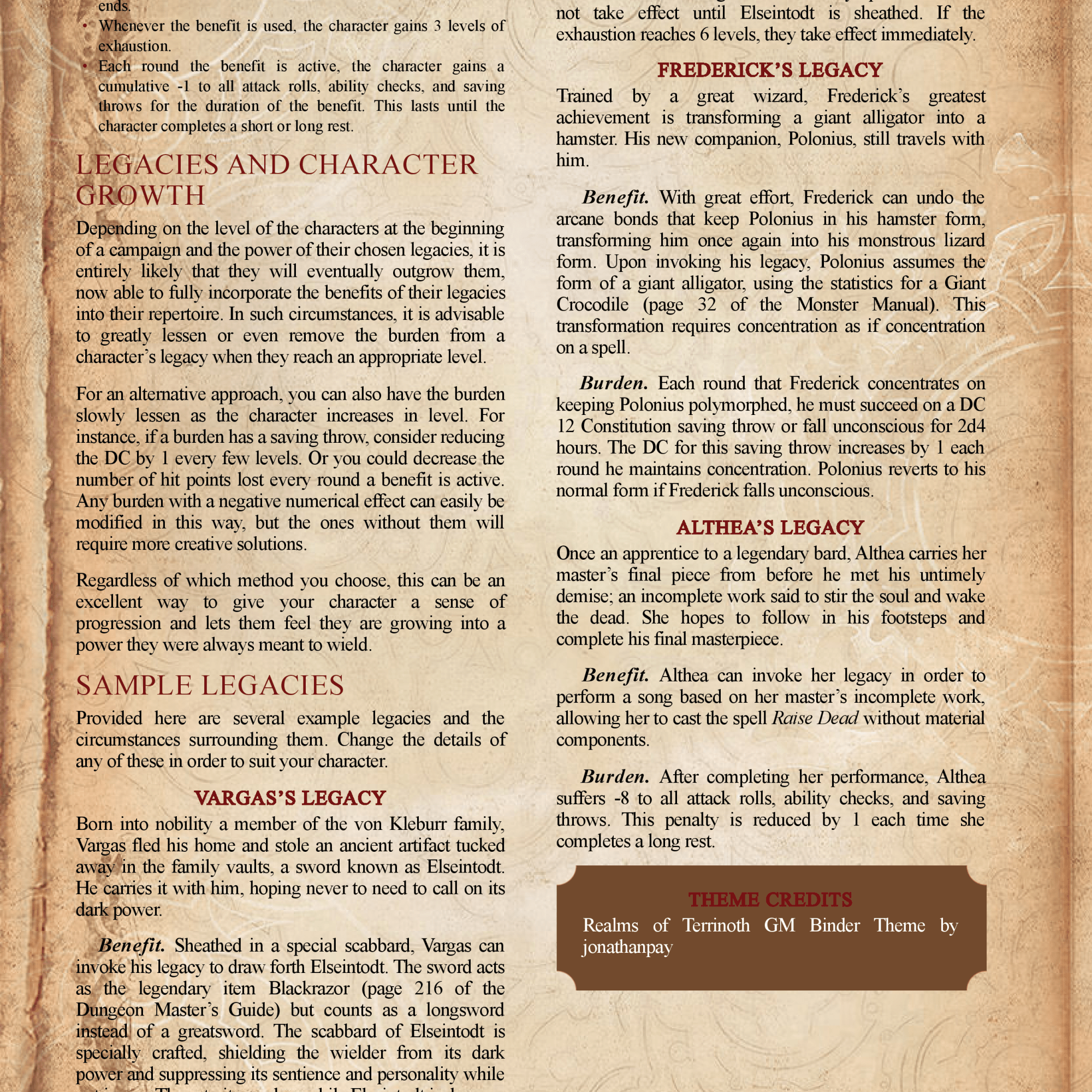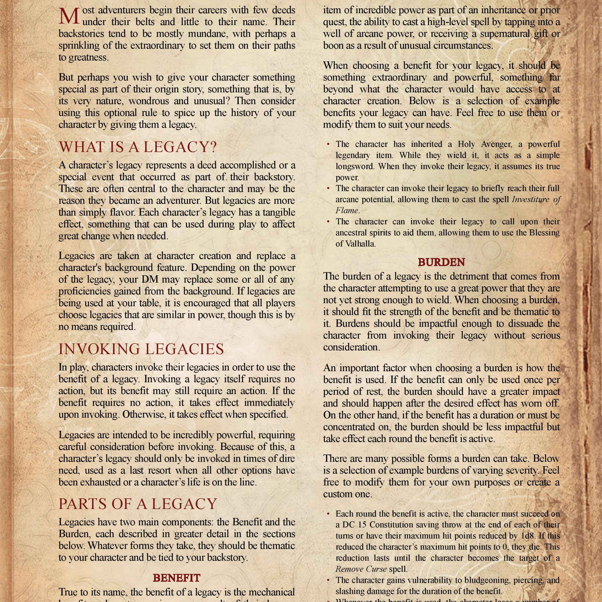 Got a fun one for y’all today! As has been the case for like 90% of my work lately, this is another commission from one of my lovely patrons. Bit of a story with this one. So basically the client is an author and in their books they have their own sort of version of D&D. Within that game, the GM has a homebrew system called legacies where characters can have a super powerful thing at character creation but it will cost them dearly to use it. So that’s what I’ve got here, a full writeup of my own interpretation of what those rules might look like but, ya know, for 5e.
