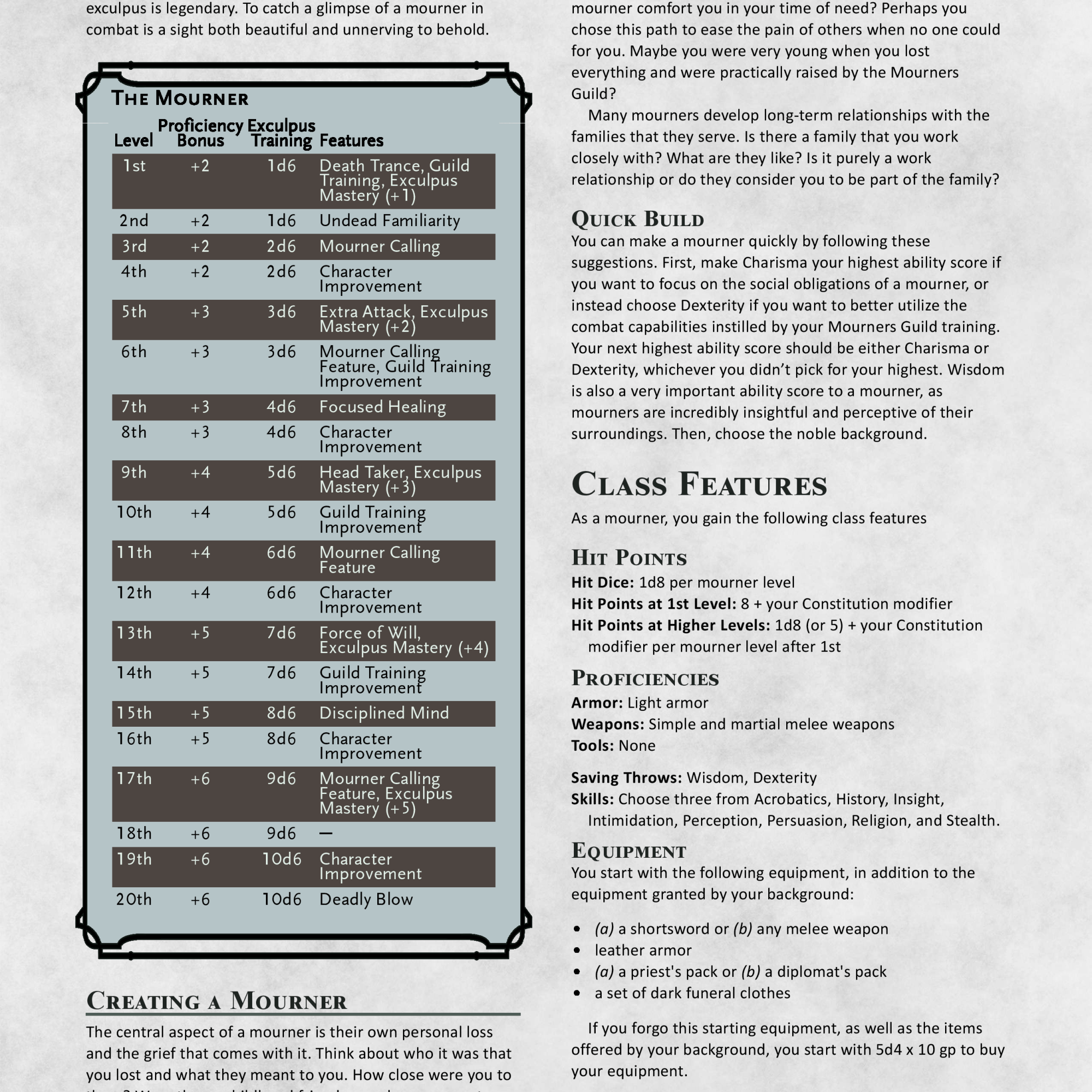 Hey all! Unbelievably excited for this one. Been a while since I’ve had a class here. I’ve been wanting to do a rework of my Mourner from the moment I started playing it. I pretty quickly figured out there were some major problems with its base mechanics and there were a few other little things I wanted to change as well. But the longer I played and the more I looked at it, the more I felt it was in desperate need of a complete overhaul as a whole.
