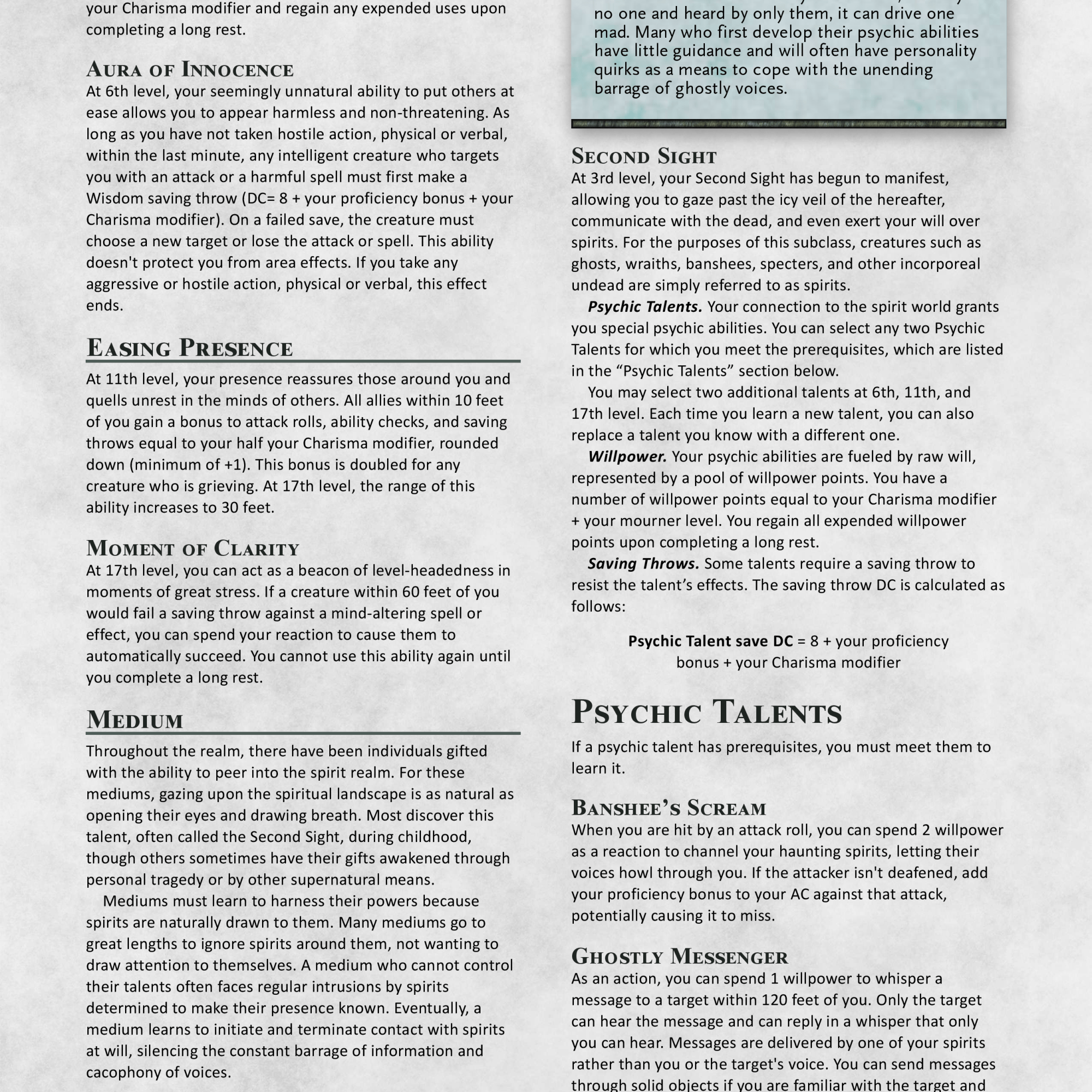 - Medium was rebuilt from the ground up to be, uh, not utterly fucking useless. No, seriously, I hate myself for writing the original medium. Not a single one of their abilities had any value whatsoever outside of very specific scenarios and they didn’t fit D&D at all. Now, you get your Second Sight at 3rd and get to choose from an enormous list of powers as you level, most of which are either from Unhallowed, Libris Mortis, or Ghostwalk. It’s got a whole new feel to it and WAY more utility. Of all the changes I’ve made this is the best one IMO.